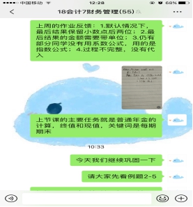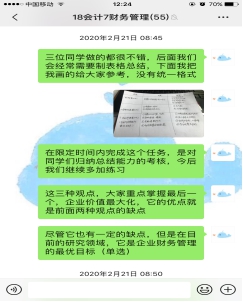 管理学院的陈晓鸣老师在开展《财务管理实务》的教学过程中,考虑到高峰期网络平台不稳定、限制流量、排队等问题,于是以微信群中开展教学内容为主,辅以学习通平台完成讨论、习题布置、观看视频等,并随时根据班级学生的接受度,调整教学进度和内容。为了保证线上教学的质量,陈老师全程采取文字录入的方式,方便学生学习,也为后期学生复习该课程的相关知识点提供了较完整的资料。但是考虑到实时录入速度的问题,陈老师将相关理论、重难点、例题、习题等提前准备,以此来提高课堂教学的效率。采用点名与抢答等多种形式,要求学生实时回答线上问题、课堂讨论,保证了学生的在线率,提高了学生的参与度。
