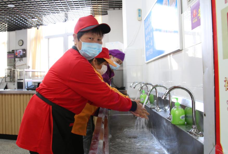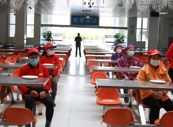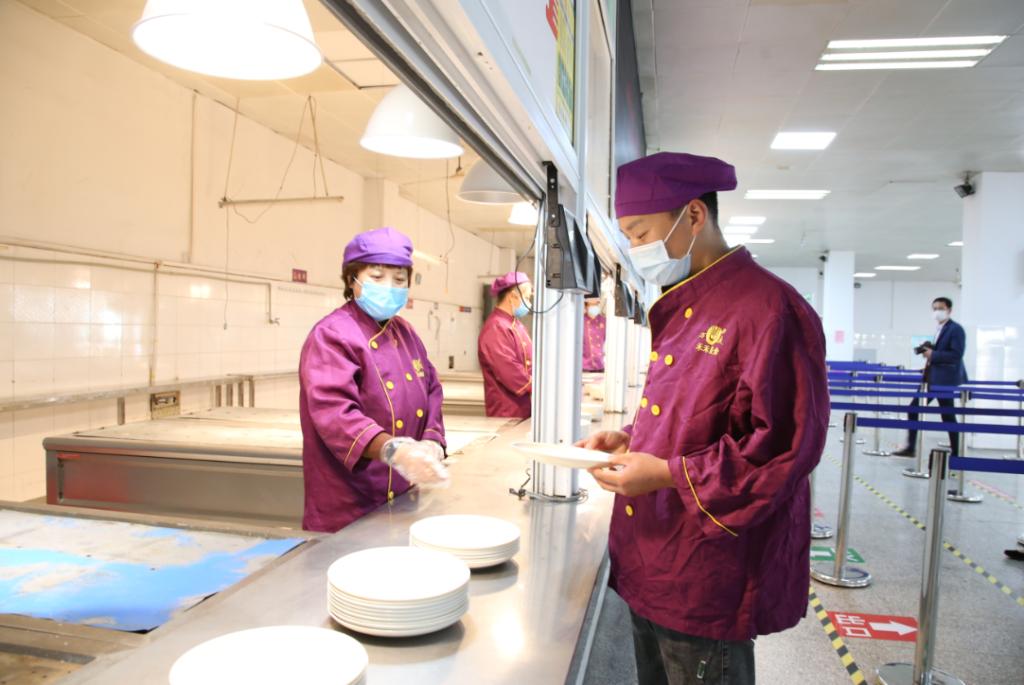 在学生餐厅,学生佩带口罩按照食堂地标指引,间隔1米排队,从就餐专用通道入口进入食堂并间隔1米排队洗手。打饭时,学生在窗口间隔排队,参照食堂提供的菜类搭配样品,选择套餐并刷卡消费。就餐时,学生根据餐厅指引标识,学生面向LED电子显示屏统一方向就座用餐,一人一桌就餐。就餐完毕后,将餐具摆放到收残处,按照食堂指定的出口离开食堂。随后,食堂按照安徽省教育厅消毒要求,规范消毒,保证了食堂环境卫生安全。