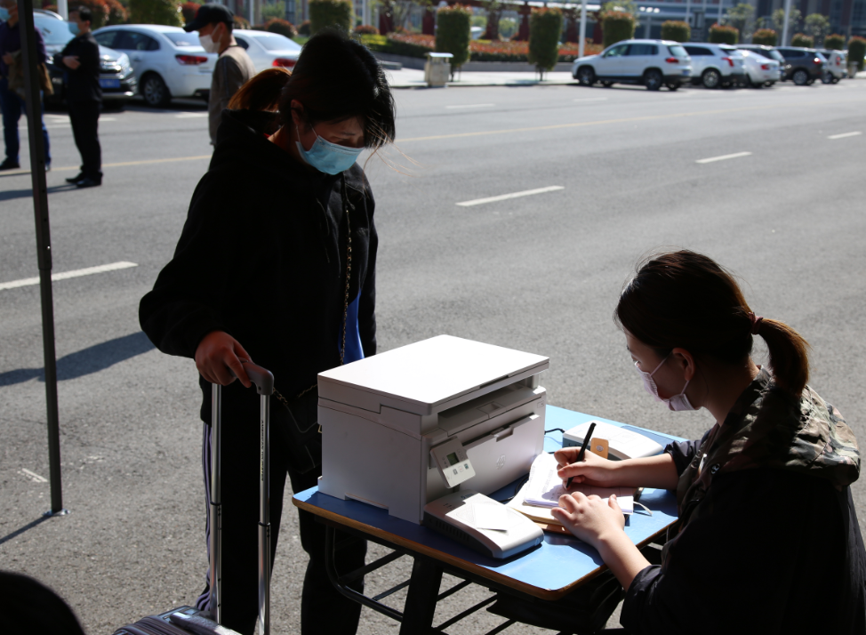 返校学生在志愿者引导下,来到本人所在教学院部报到点接待通道,间隔1米有序排队,并刷卡(身份证)报到、进行个人行程轨迹等相关信息登记,提交提前填写好的个人基本健康档案、承诺书后,领取报到凭证。对于人行程轨迹有与感染接触的同学,进行留置观察,对体温异常情况(≥36.8℃)的同学,进行应急隔离处置。