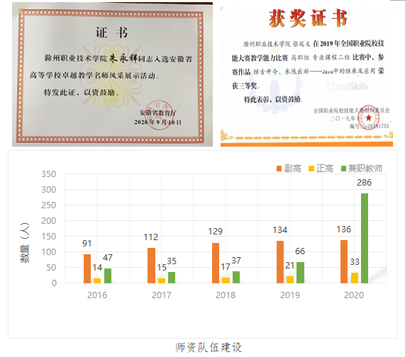 学校坚持全面推进人才强校战略,强化“内培外引”,积极引进和培育高层次人才。“十三五”末,学校教职工547人,其中专任教师434人,硕士以上学位教师392人。正高职称由14人增加到33人,副高职称由91人增加到136人。有省级高水平教学团队13个,省级教学名师8名,省级教坛新秀19名,1名教师入选安徽省高校百位卓越名师、卓越教学新秀风采展。教师获得教学能力大赛国家级三等奖1项,省级一等奖1项、二等奖6项、三等奖10项。