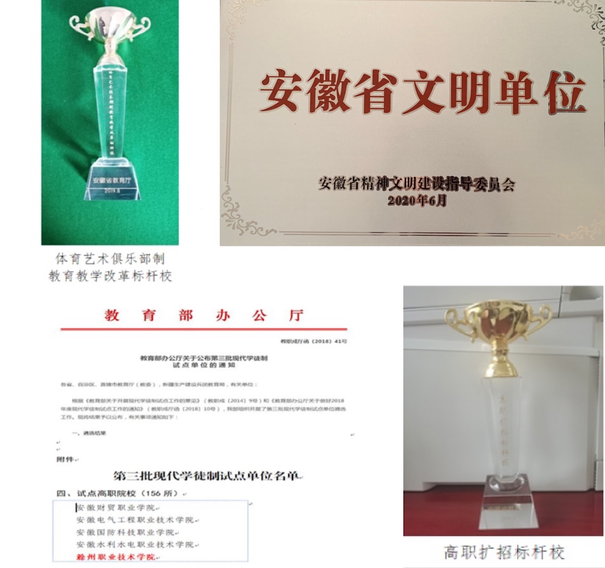 学校确立了“地方性、技能型、合作式、特色化”的办学定位,明确“建成国内知名、省内一流、特色鲜明地方技能型高水平大学”的发展目标,理清综合改革思路,得到广泛认可。学校先后获得“安徽省文明单位”“安徽省创新创业示范校”“省级创业学院建设单位”“第三批现代学徒制试点单位”“首批1+X证书制度试点院校”“体育艺术俱乐部制教育教学改革标杆校”“高职扩招标杆校”等荣誉称号。
