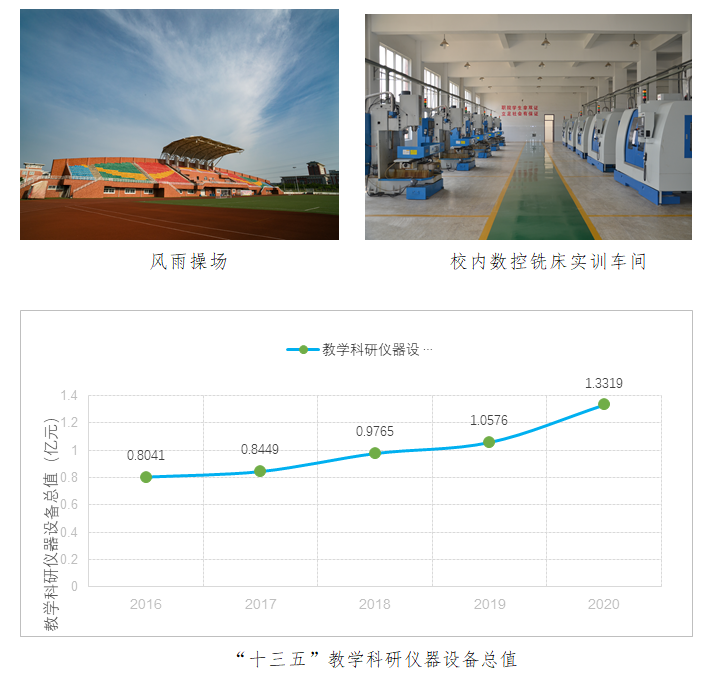 2020年全校预算收入26370万元,比2015年的12893万元增长13477万元,增幅达105%。“十三五”期间,学校大力推进龙蟠校区项目建设,完成学生公寓、实训楼、后勤服务中心、风雨操场等工程及其周边环境配套设施建设,共新建各类单体建筑6个,新增建筑面积78649平方米。目前学校单体建筑已达23个,建筑面积31万平方米。新增绿化面积12万平方米。建有校内实验实训室95个,校外实训基地157个。教研仪器设备总值从9786万元增至13357万元。馆藏纸质图书26万册,电子图书56万册。校园网出口带宽由原来的400M增加到现在的20G,实现校园网络无线全覆盖,信息化管理和服务水平不断提高。学校办学条件明显改善,校园功能日趋完备,校园环境更加优美。