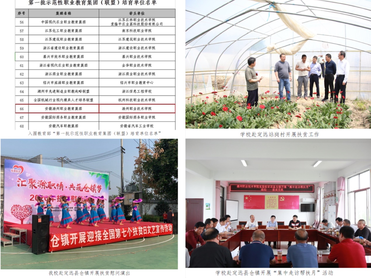 学校坚持立足地方、服务地方、贡献地方,强化应用研究和产学研合作。作为首届理事长单位,牵头成立了安徽滁州职教集团,集团成员单位127家,专业委员会12个。集团获“安徽省首批示范职教集团”,并入围教育部“第一批示范性职业教育集团(联盟)培育单位名单”。与地方近百家企业和事业单位签署技术研发、技术服务、技术咨询类横向课题108项,立项经费901万元。积极出台促进科技成果转移转化配套政策和实施办法,大力加快学校科技成果转移转化进程,完成科技成果转化88项,转化金额139.85万元。选派2名优秀干部任驻村第一书记,定点帮扶定远县仓镇、吴圩镇脱贫攻坚。扎实开展“定向采购”,累计采购贫困村各类农副产品价值102万元。支持贫困村帮扶资金(含师生捐款)711307元,用于人居环境治理、基础设施建设改造。重视科技扶贫,与定远清爽葡萄种植合作社成立产学研基地,共同申请国家专利2项。近五年开展社会培训、技能鉴定均超过20000人次。
