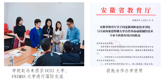 稳步推进与国(境)外交流合作,先后与韩国、马来西亚等国家2所高校签约合作。与马来西亚沙捞越大学合作开展“优秀交流生计划”项目。获批与马来西亚思特雅合作举办动漫制作技术专业专科教育项目资质,每年招收计划35人。完成留学生宿舍配套建设。“十三五”以来,共有教师30余人次、学生46人次赴国(境)外高校研修。