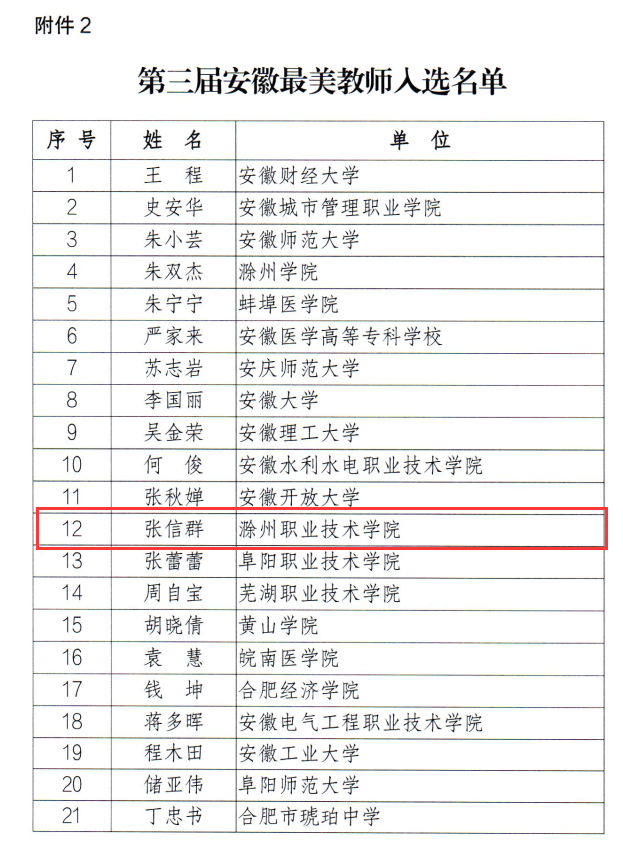 据悉,安徽最美教师每两年评选一次,本届首次面向高校教师推选,旨在褒扬广大教师立德树人,爱岗敬业,为人师表,严谨治学的先进事迹。最终,全省共有119名教师入选“第三届安徽最美教师”名单,其中高校教师20名。