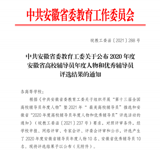近日,中共安徽省委教育工委下发了《关于公布2020年度安徽省高校辅导员年度人物和优秀辅导员评选结果的通知》(皖教工委函〔2021〕288号)文件,Beat365传媒与设计学院辅导员刘娟获2020年度安徽省辅导员年度人物。全省共有10名辅导员获此殊荣,有8所本科院校,2所高职院校。同时,刘娟被推荐参加教育部“第十三届全国高校辅导员年度人物”暨2021年“最美高校辅导员”评选。