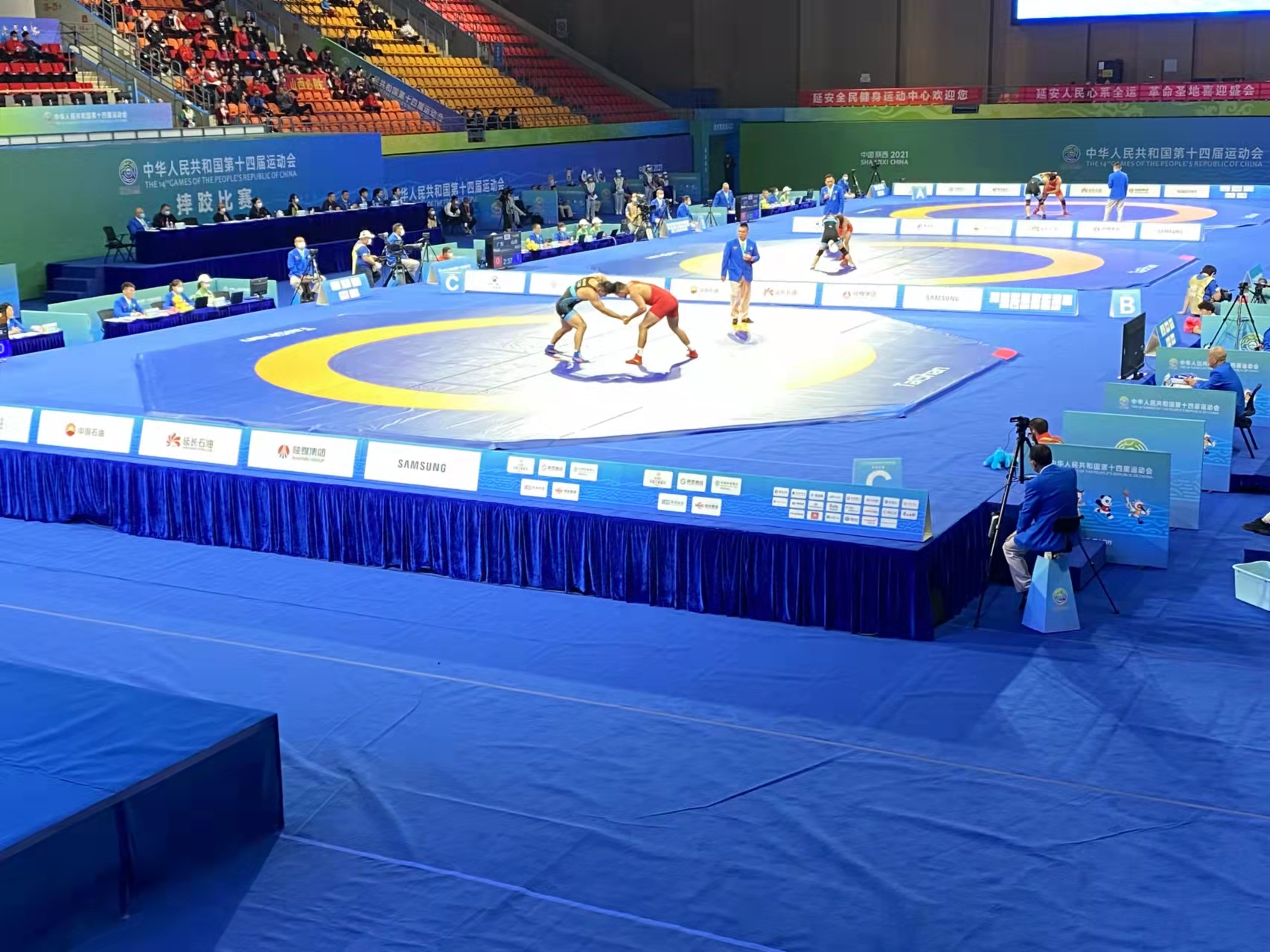 中华人民共和国第十四届运动会摔跤比赛由国家体育总局主办,陕西省人民政府承办,于2021年9月23日-26日在革命圣地延安举行。全运会摔跤项目分古典式摔跤、男女自由式摔跤三个小项共18个公斤级,产生18枚金牌18枚银牌36枚铜牌,是全运会仅次于田径、游泳的第三大金牌运动项目。