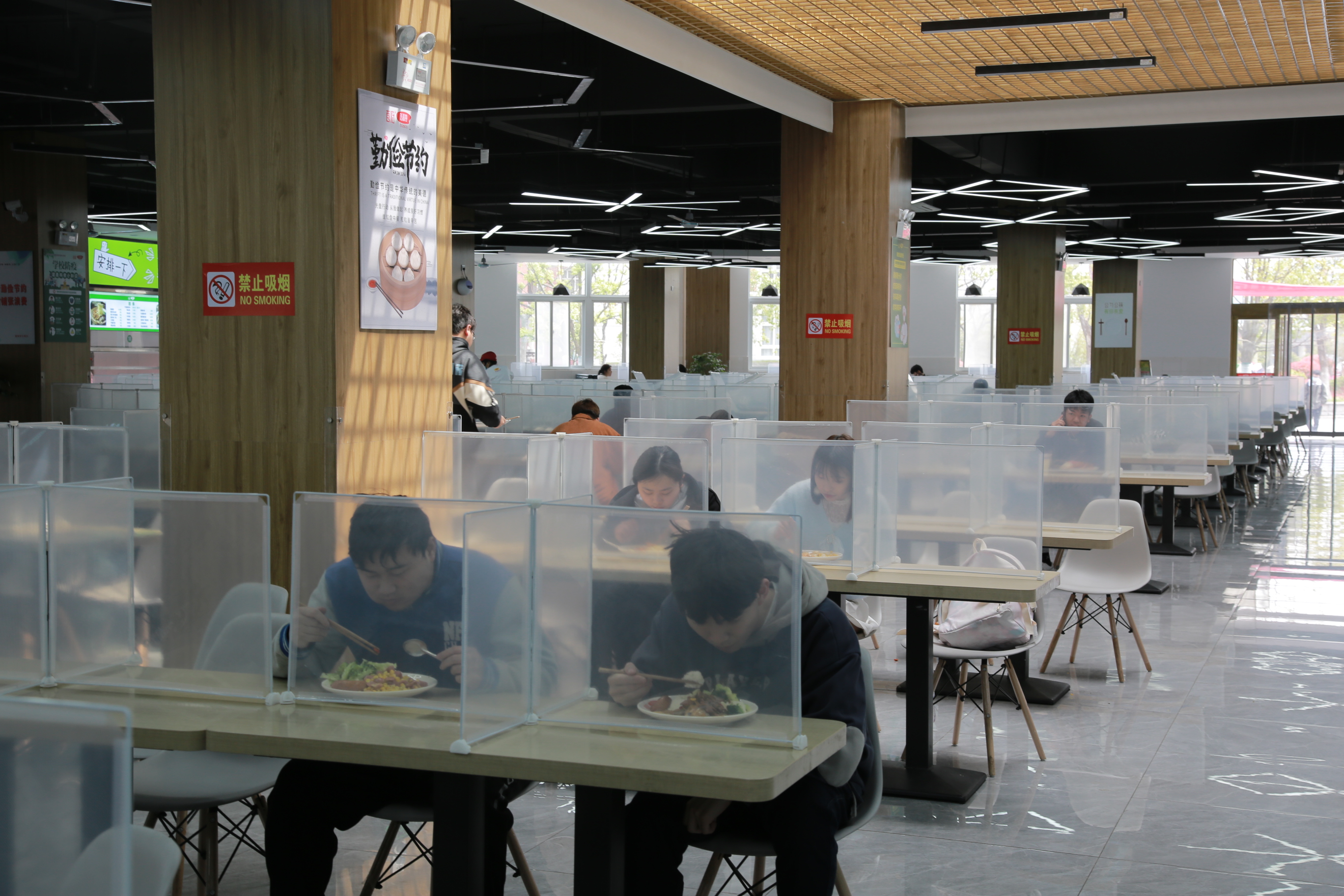 入口处,按照“规定动作”一米间隔、戴好口罩进入食堂排队取餐后回到座位,再取下口罩用餐,美食入口的瞬间,回味无穷。
