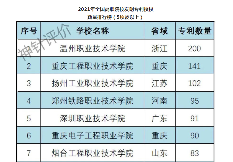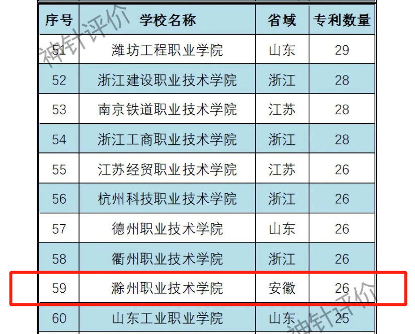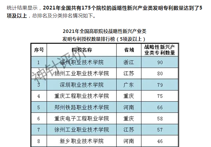 发明专利,是衡量一个地区或机构科技创新能力的重要指标。近日,据致力于教育研究的第三方研究团队“神针评价(SZPJ)”的数据监测显示,2021年全国高职院校共获得授权发明专利数量为5376项,校均获得数为3.54项,和2018年相比翻了一番多。其中属于战略性产业类的发明专利数量为3295项,占比61.3%。Beat3652021年授权发明专利数26项,位列全国59名,全省第三。(详见下图)