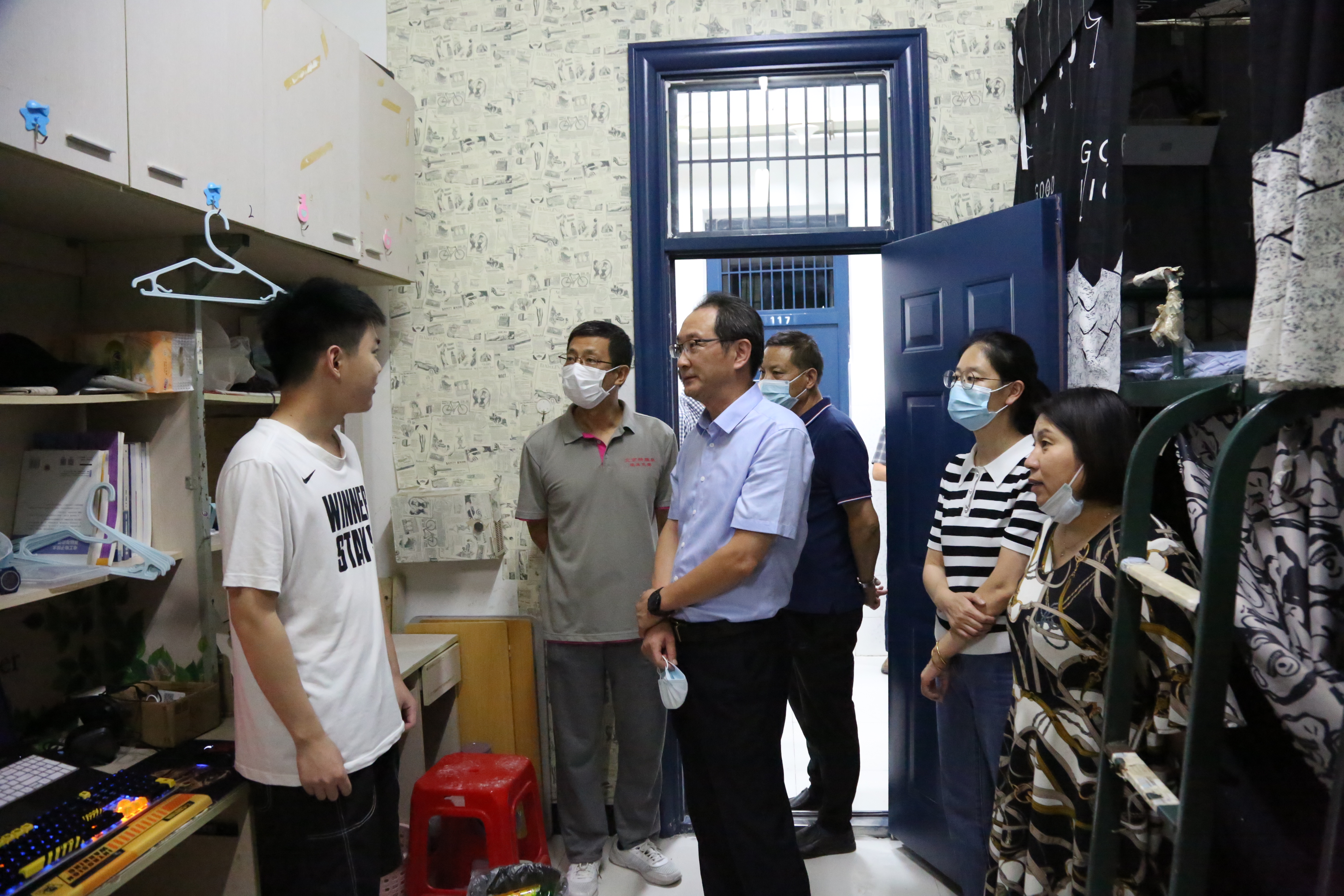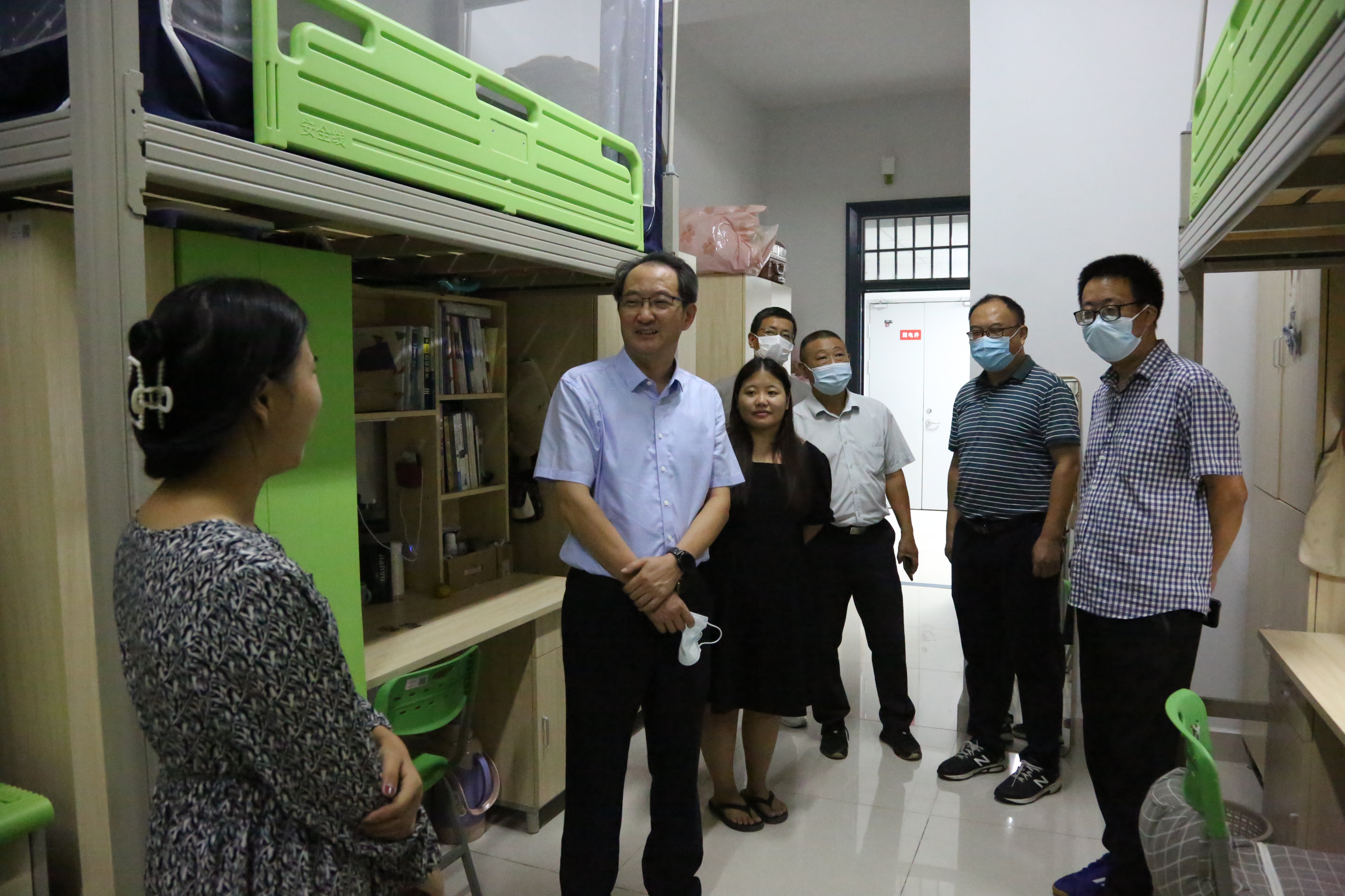 许雪峰一行来到学生宿舍楼看望慰问在校学生,为同学们送上节日祝福与关心。“有没有拿到学校发的月饼?”“同学们还有没有什么困难和要求?”许雪峰与同学们进行了亲切交谈,并号召同学们做好防护、认真落实疫情防控要求,勉励同学们珍惜时光,认真学习,健康成长。学校的关怀让同学们倍感温暖,大家纷纷表示会严格遵守疫情防控各项规定,以积极向上的心态投入到学习与生活之中,不辜负学校的殷殷期望!