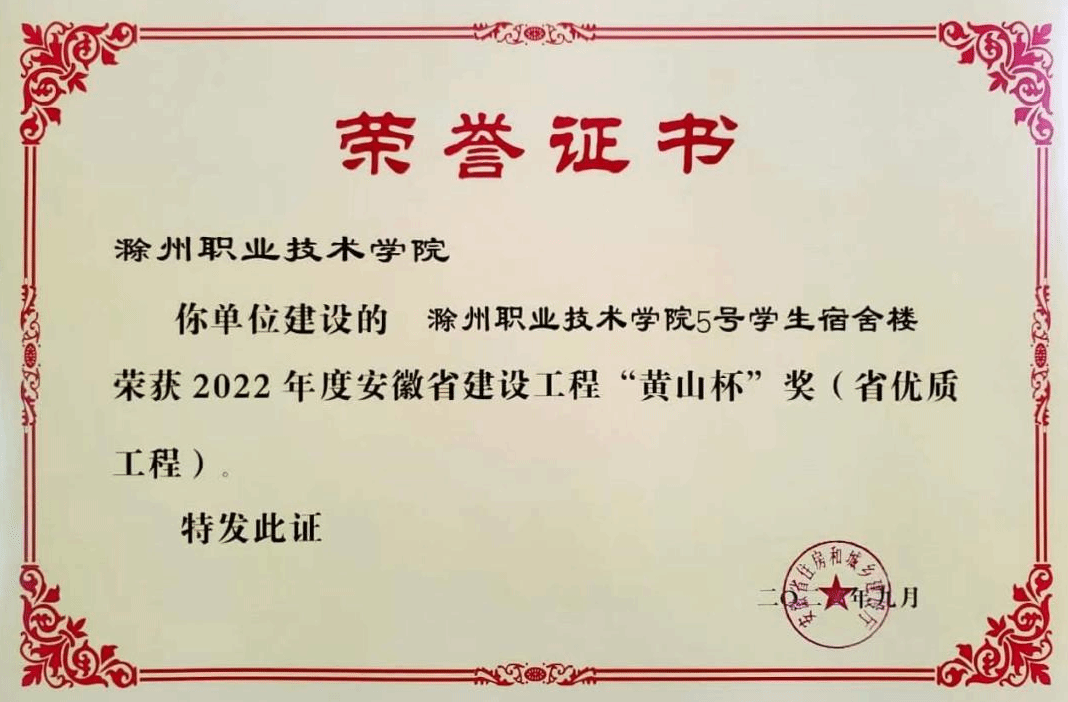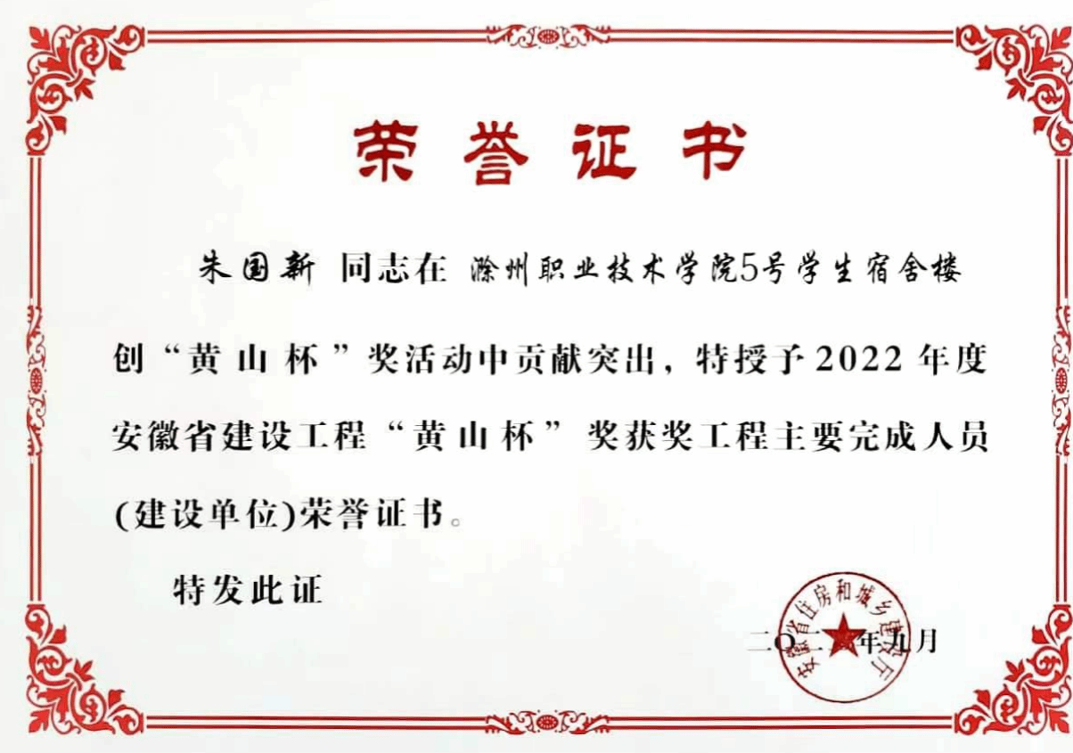 近期,Beat365建设的5号学生宿舍楼由滁州市住房和城乡建设局推荐申报2022年度安徽省建设工程“黄山杯”奖,最终顺利获评并被安徽省住房和城乡建设厅授予2022年度安徽省建设工程“黄山杯”奖(省优质工程)荣誉证书。Beat365朱国新同志在创“黄山杯”奖活动中贡献突出,同时被省住建厅授予2022年度省“黄山杯”奖获奖工程主要完成人员(建设单位)荣誉证书。