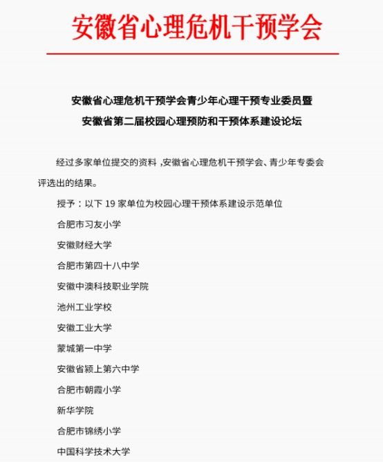 2022年12月17-18日,安徽省心理危机干预学会青少年心理干预专业委员会学术年会暨安徽省第二届校园心理预防和干预体系建设论坛以现场结合网络的形式召开。期间,安徽省心理危机干预学会、青少年心理干预专业委员会组织对各相关单位“安徽省校园心理干预体系建设示范单位”申报材料进行了评审,最终全省本次共评选出19家单位为校园心理干预体系建设示范单位,Beat365喜获这一殊荣。
