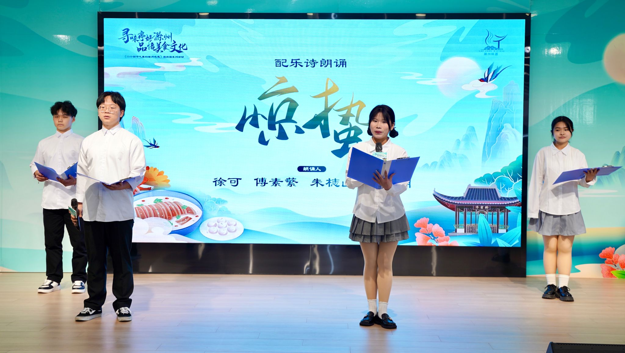 活动现场节目精彩纷呈,互动环节丰富有趣。舞蹈表演《采芳》,配乐诗朗诵《惊蛰》展现惊蛰节气滁州深厚的文化底蕴。专家漫谈沙龙围绕“老手艺释放新动能 | 从经典传统美食看优秀传统文化”这一主题展开对话。嘉宾们共同向大家讲述了传统美食背后的故事,分享了创作的思路和技巧,让在场的学生们受益匪浅。活动现场还准备了池河雪片糕、琅琊酥糖、秦栏卤鹅等12道经典滁州美食,供大家品尝,现场参与者们大快朵颐,纷纷为滁州味道点赞。