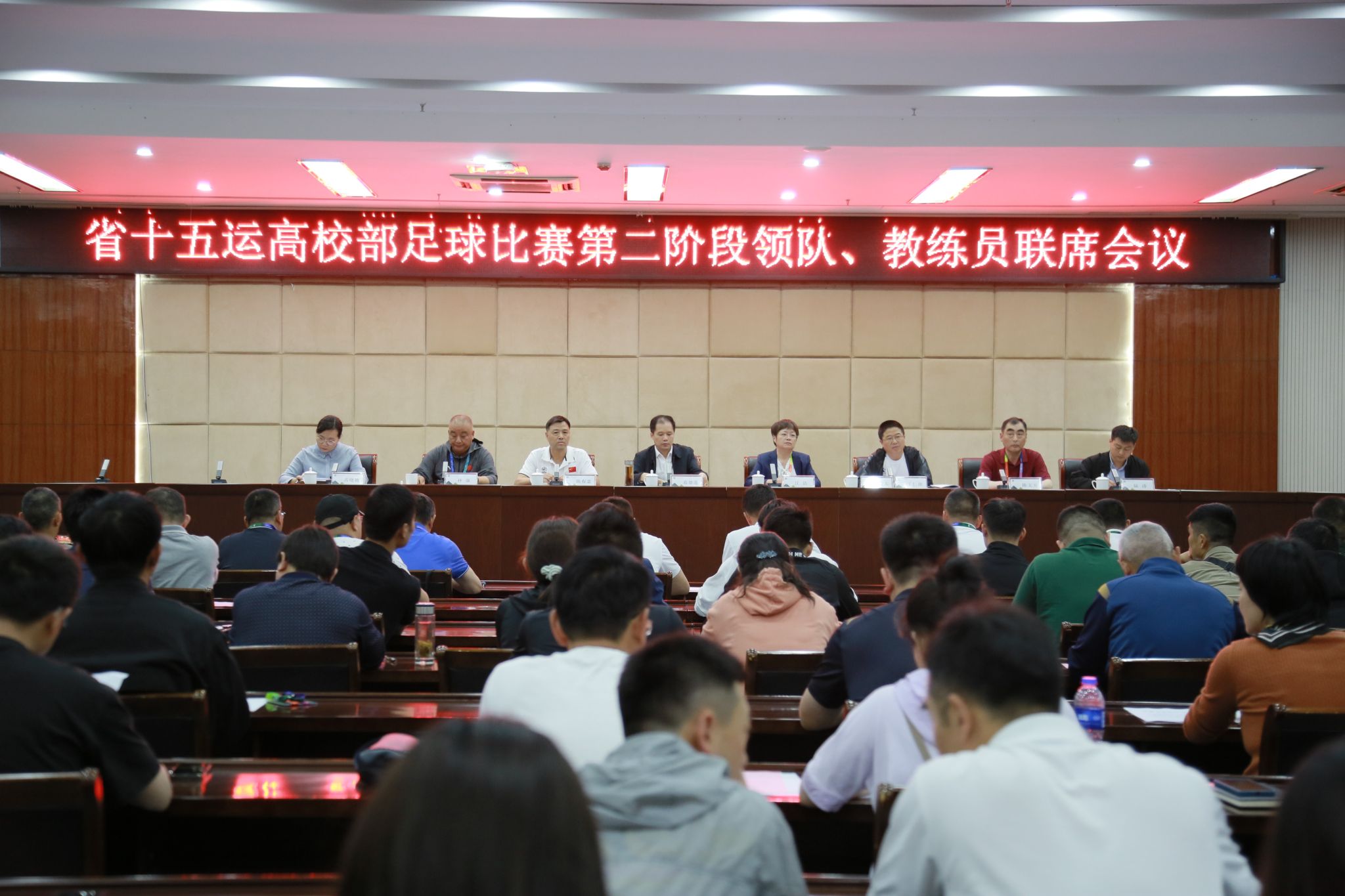 4月17日晚,省十五运高校部足球比赛第二阶段领队、教练员联席会议在Beat365唯一官方网站综合楼5楼会议室召开。省教育厅体卫艺处副处长葛德连、Beat365党委委员江洁、省教育厅离退休处调研员丁仁能、足球比赛仲裁陈有忠、Beat365唯一官方网站体育部主任孙强、省教育厅体卫艺处陆涛、滁州市第一人民医院呼吸与危重症医学科二病区副主任医师芮晓艳等出席会议,全体领队、教练员参加会议。会议由丁仁能主持。