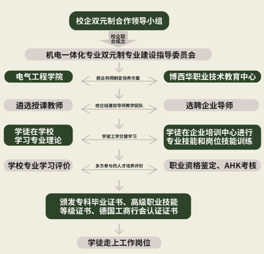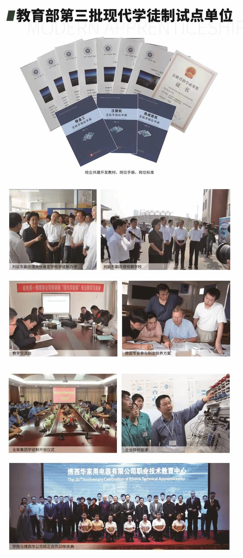 学校积极推进教学改革,努力探索产教融合、校企合作办学之路。学校与博西华家用电器有限公司等企业深度合作,采用“现代学徒制”的模式培养企业岗位需求的技能型人才。2017年5月,安徽省教育厅、安徽省经济与信息化委、安徽省国资委联合授予博西华公司“安徽省首批校企合作示范基地”, 2018年8月学校确立为教育部“现代学徒制试点”单位,2021年10月通过教育部验收。学校与博西华公司校企深度合作“订单培养、双元施教”的教育,在教学上主要按照德国“双元制”教学模式实施,并在实施多年的过程中逐步进行了“本土化”的改革,更适应中国国情和“现代学徒制”的要求,2019年12月学校现代学徒制人才培养模式实践工作获得安徽省教学成果一等奖,2022年11月由安徽省教育厅推荐参评2022年国家职业教育教学成果奖。