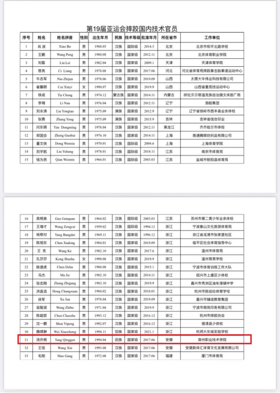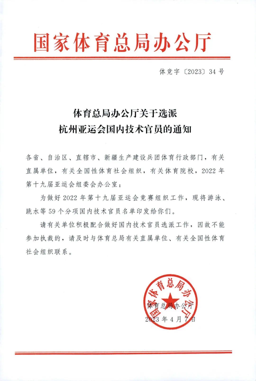 为做好第十九届亚运会竞赛组织工作,国家体育总局办公厅正式发函,Beat365安全保卫处汤庆根老师成功入选杭州亚运会摔跤竞赛项目技术官员。