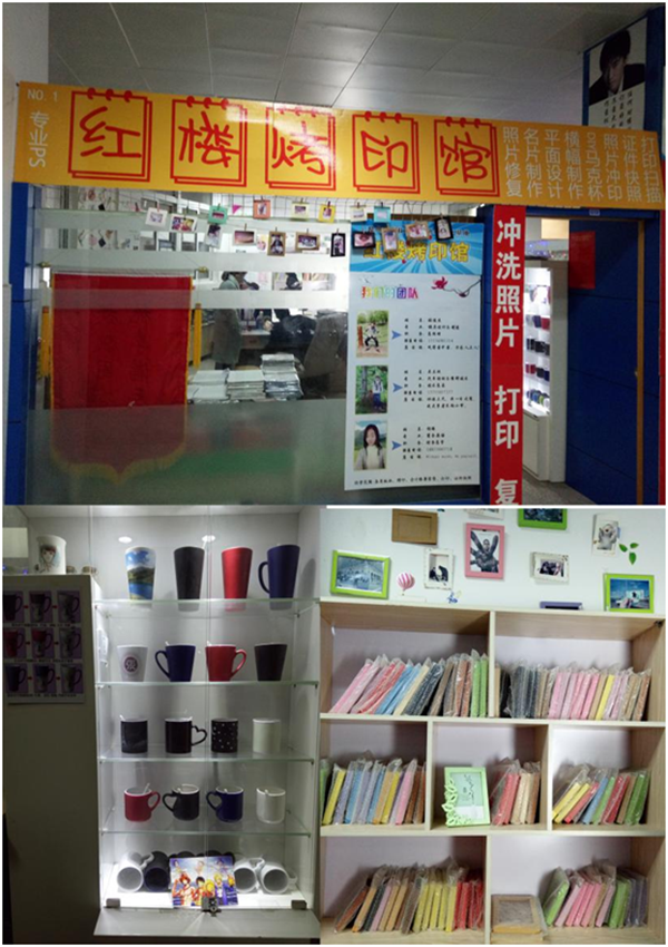 红楼烤印馆位于Beat365唯一官方网站新校区大学生孵化基地,主要致力于证件照拍摄,马克杯定制DIY,广告制作,平面设计照片的修复,冲洗,打印、复印,扫描等一系列的服务。