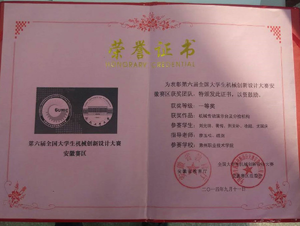 在参加的各项专业技能竞赛中,白天徐超和队友们积极准备参赛作品,在作品的整个加工制造过程中,他放弃了五一的休假,在实训车间加班加点准备参赛作品,晚上与队友积极备战,每天晚上都在计算机房集训,从无半点懈怠。一分耕耘一分收获,徐超先后获得了第六届全国大学生机械创新设计大赛安徽省赛区一等奖及全国决赛二等奖、国家“实用新型专利”、第十届全国Catics网络赛高职组二等奖。并在2015年安徽省“双创之星”评选中脱颖而出,荣获省“创新之星”荣誉称号。