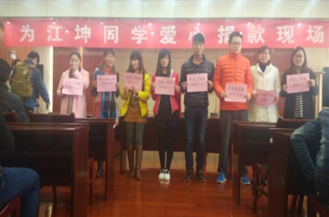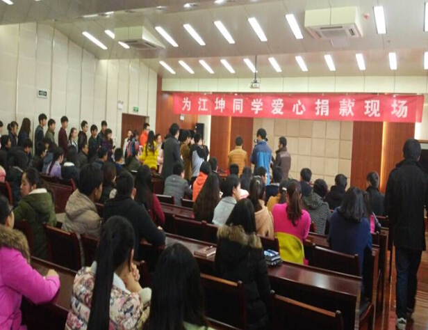 3月18号下午2点10分,Beat365唯一官方网站的全体师生代表在综合楼十一楼为江坤同学举办了募捐活动。
