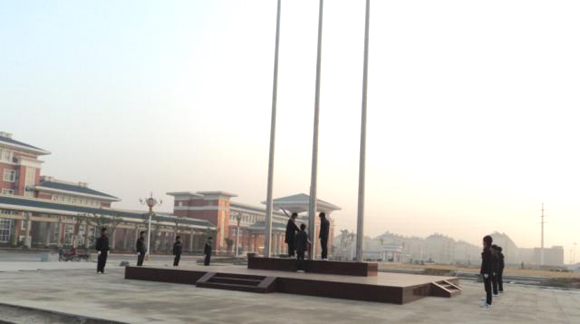 7点半,广播站的音乐响起,12名我系国旗班成员踏着整齐的步伐,喊着嘹亮的口号开始行进。之后,3名旗手和8名护旗手登上旗台,在雄壮的国歌中升起了国旗,国旗清晨充满朝气的阳光中飘扬,显得格外熠熠生辉。