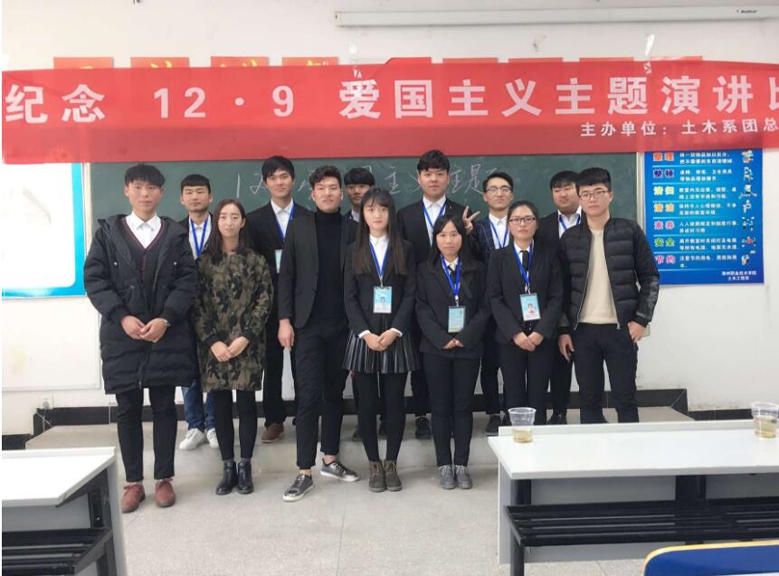 爱国主义教育是提高全民族整体素质的基础性工程,是引导人们特别是广大青少年树立正确理想、信念、人生观、价值观,是促进中华民族振兴的一项重要工作。为培育未成年人心向党、跟党走的高尚情感和远大志向。土木工程系于12月9日在土木楼4119阶梯教室组织了以“129爱国运动”为主题的演讲活动。大赛邀请了团总支书副书记赵绅尧,学生会主席涂鹏、副主席张康康、马驰骋、马哲明以及秘书处部长刘肇琨担任本次大赛的评委。