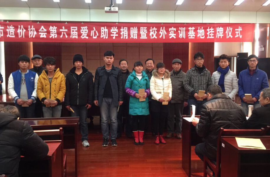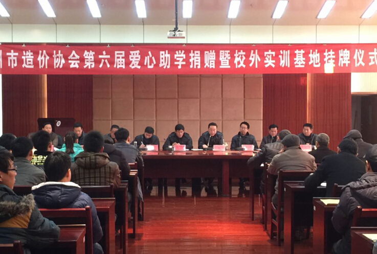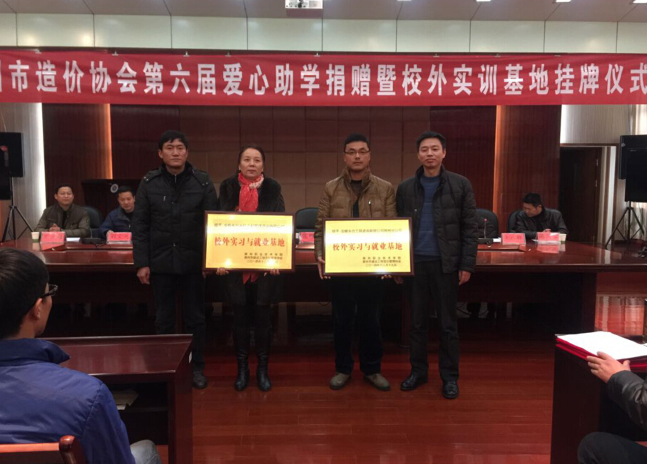 12月30日在我院综合楼楼十一楼,土木系和市建委造价站联合举办了滁州市造价协会第六届爱心助学捐赠暨校外实训基地挂牌仪式。学院党委委员、副院长汪上、土木系主任朱永祥、书记刘文元以及市建委和造价站的相关领导以及全市所有造价企业的法人参加了本次仪式。