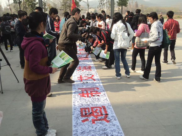 另外,在讲座结束以后,院红十字会在食堂北门广场举行了相关的横幅签名宣传活动及佩戴红丝带相关活动,并发放了相关宣传材料,我系200名左右的红十字分会会员和许多路过的学生参加此项活动。表示要以实际行动做到“遏制艾滋,履行承诺”。
