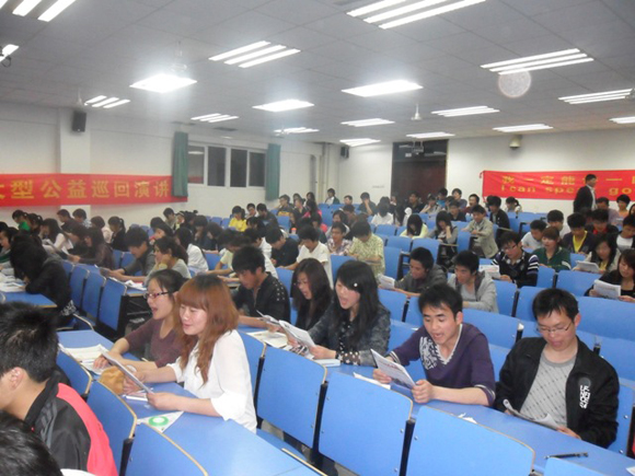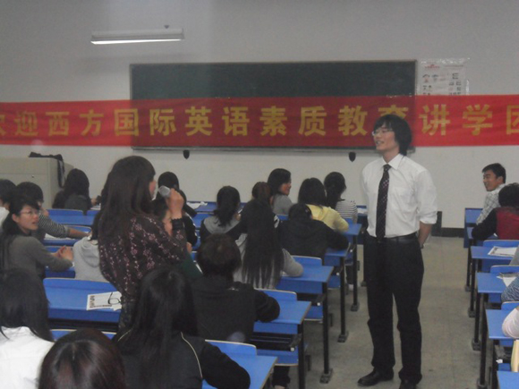 2011年4月15日 ,土木工程系盛邀西方国际英语素质讲学团到我院演说。 中国美语语音第一人 西方国际英语总校校长 中国著名留美学者 王光照(sam)老师现场传授学生们公众演说、团队合作、潜能激发、感恩等课程内容,现在气氛火爆,师生互动新颖,同学们积极性高涨!