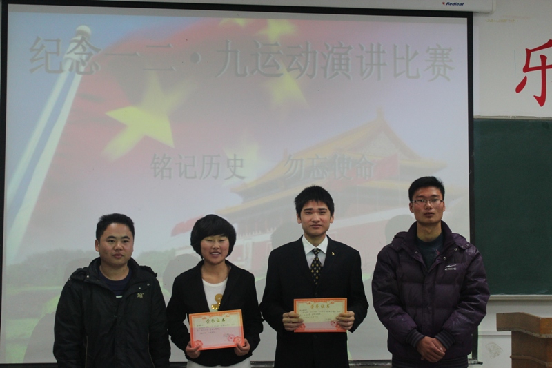 在土木系团代会刚刚圆满落下帷幕之际,为激发广大同学的爱国主义精神,纪念“一二九”运动中的所体现出来的广大青年学生的优秀品质,土木系刘书记亲自提出,由系学生会主办,在12月12日举办纪念“一二.九”运动演讲比赛的决赛,此前已经在12月9日有过预赛,角逐出了十多名同学进复赛,演讲比赛的每一位参加者都高度重视,从服装到仪态都精心准备,各位选手声情并茂地演讲,充分体现出我系青年的热爱祖国的热情。