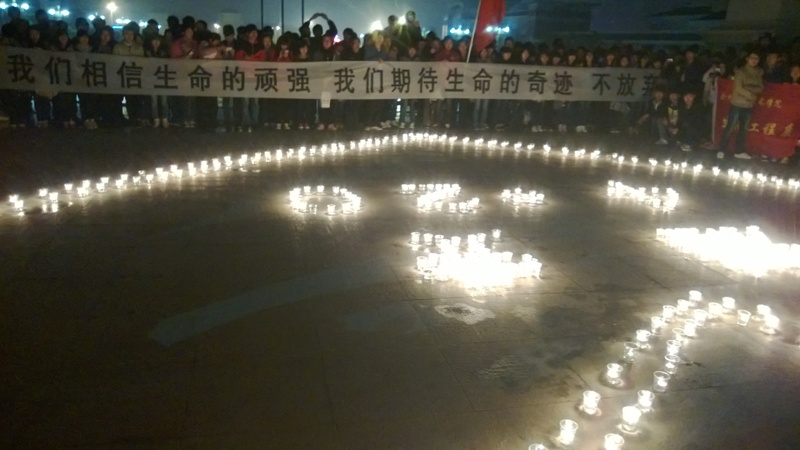 当天晚上,虽然是天气较冷,还有绵绵细雨,但仍有很多同学前来参加活动。现场的红色蜡烛被摆放成“心”形,里面的蜡烛被摆放成“4·20”形。蜡烛点燃后,学生们进行了简短的默哀祈福,也有不少学生高呼“四川加油”、“雅安加油”等口号。烛光中,他们真诚的眼神代替了千言万语,一束束烛光点亮他们为灾区鼓劲的信心。