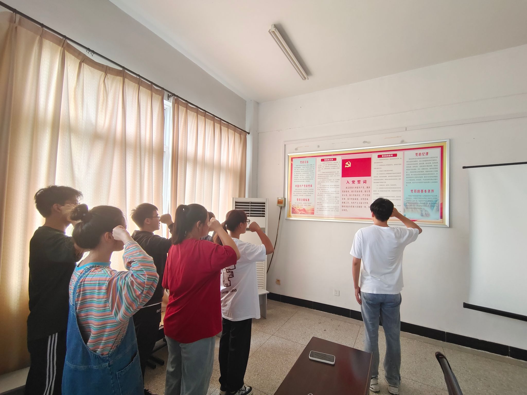 随后,全体学生预备党员在学院会议室对着鲜红的党旗,重温入党誓词。同学们纷纷表示将在今后的学习生活中坚定理想信念,发扬实干精神,在学习中发挥敢吃苦、不怕苦的精神,时刻以一名党员的身份严格要求自己。