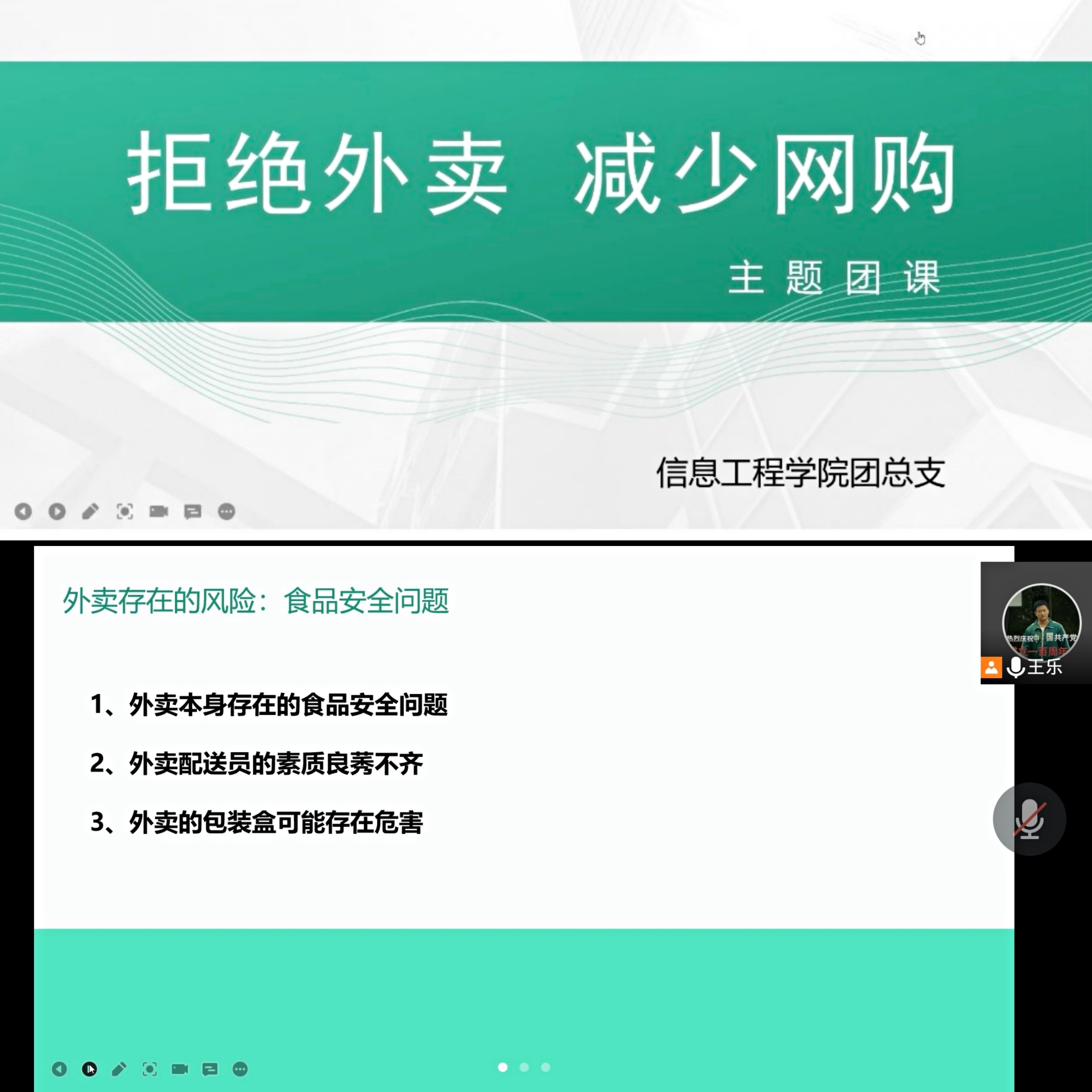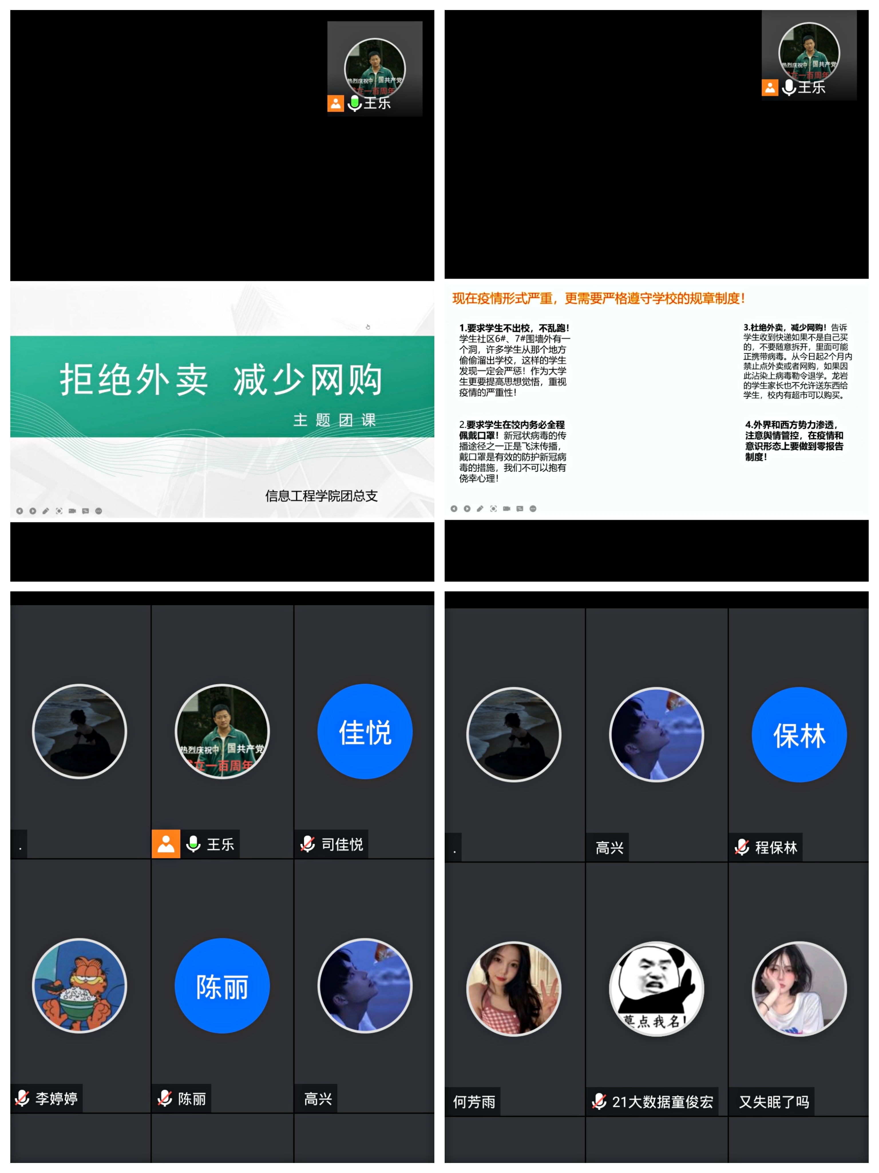 为响应校团委号召,拒绝外卖、减少网购,增强食品安全意识,健康生活,降低病毒传播风险。在这特殊时期,信息工程学院团总支充分利用云课堂于4月1日下午积极开展“拒绝外卖 减少网购”疫情防控主题团课活动。由团总支副书记王乐主持,各班级团干部参加。