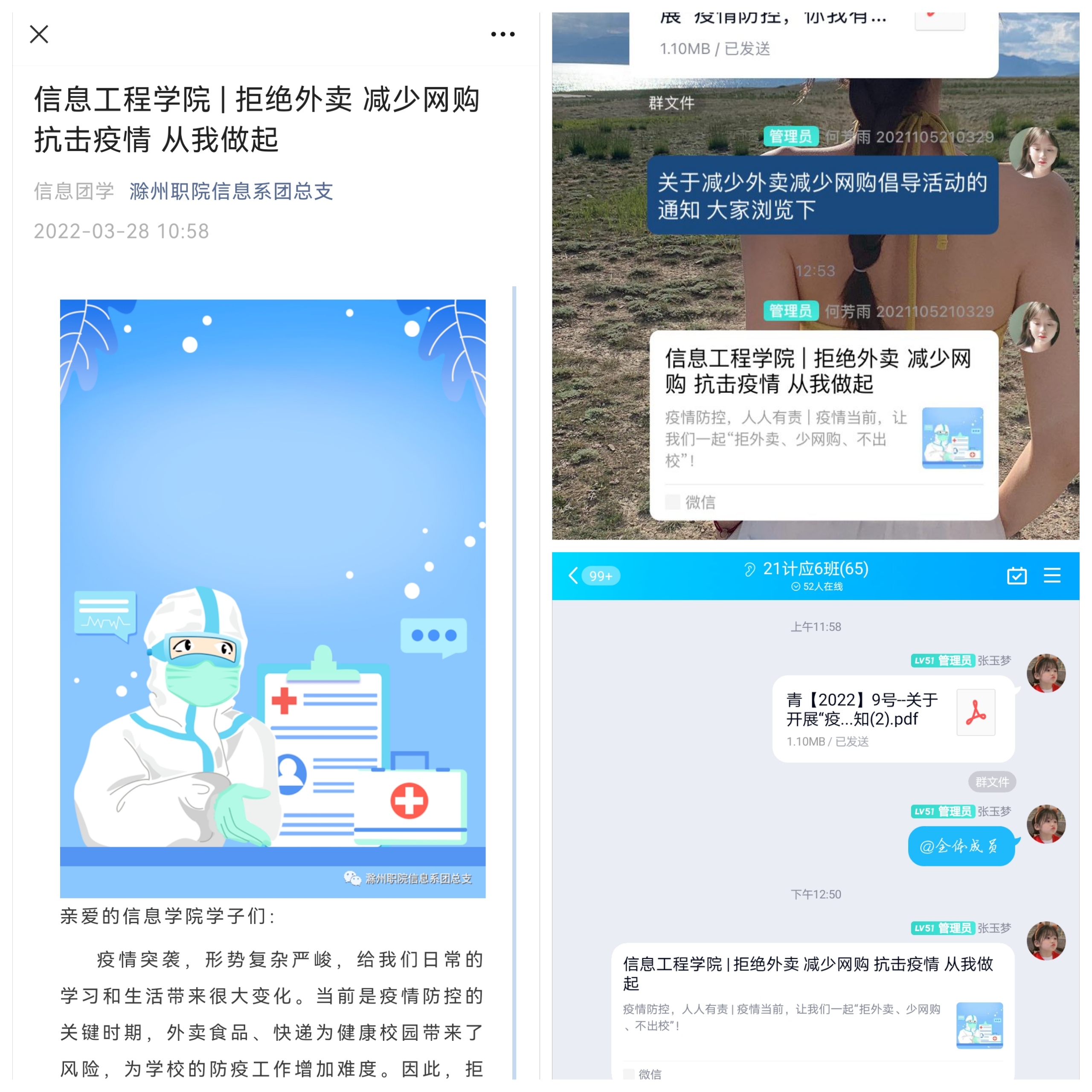 同时,我院团总支在微信公众平台发布了“拒绝外卖 减少网购 抗击疫情 从我做起”倡议书,会议后各班团支书积极转发到班级群并传达有关主题团课的会议精神,号召我院广大同学能积极配合学校疫情防控工作,齐心协力筑牢疫情防线。