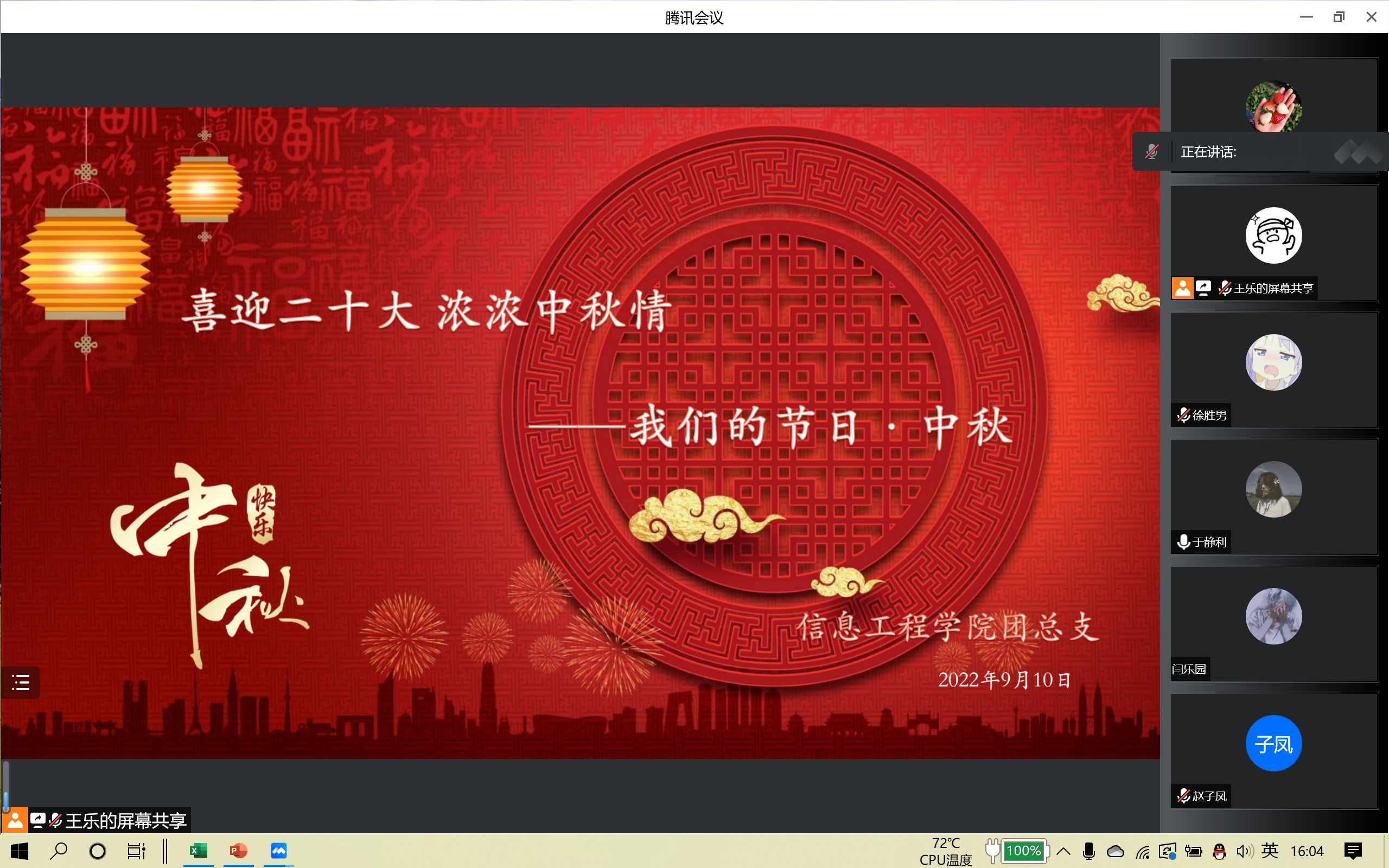 金秋九月,丹桂飘香。中秋节来临之际,为弘扬中华传统文化,增强学生对传统节日的认识,营造浓厚的节日氛围。9月10日,信息工程学院团学组织开展了以“喜迎二十大 浓浓中秋情”为主题的线上活动。