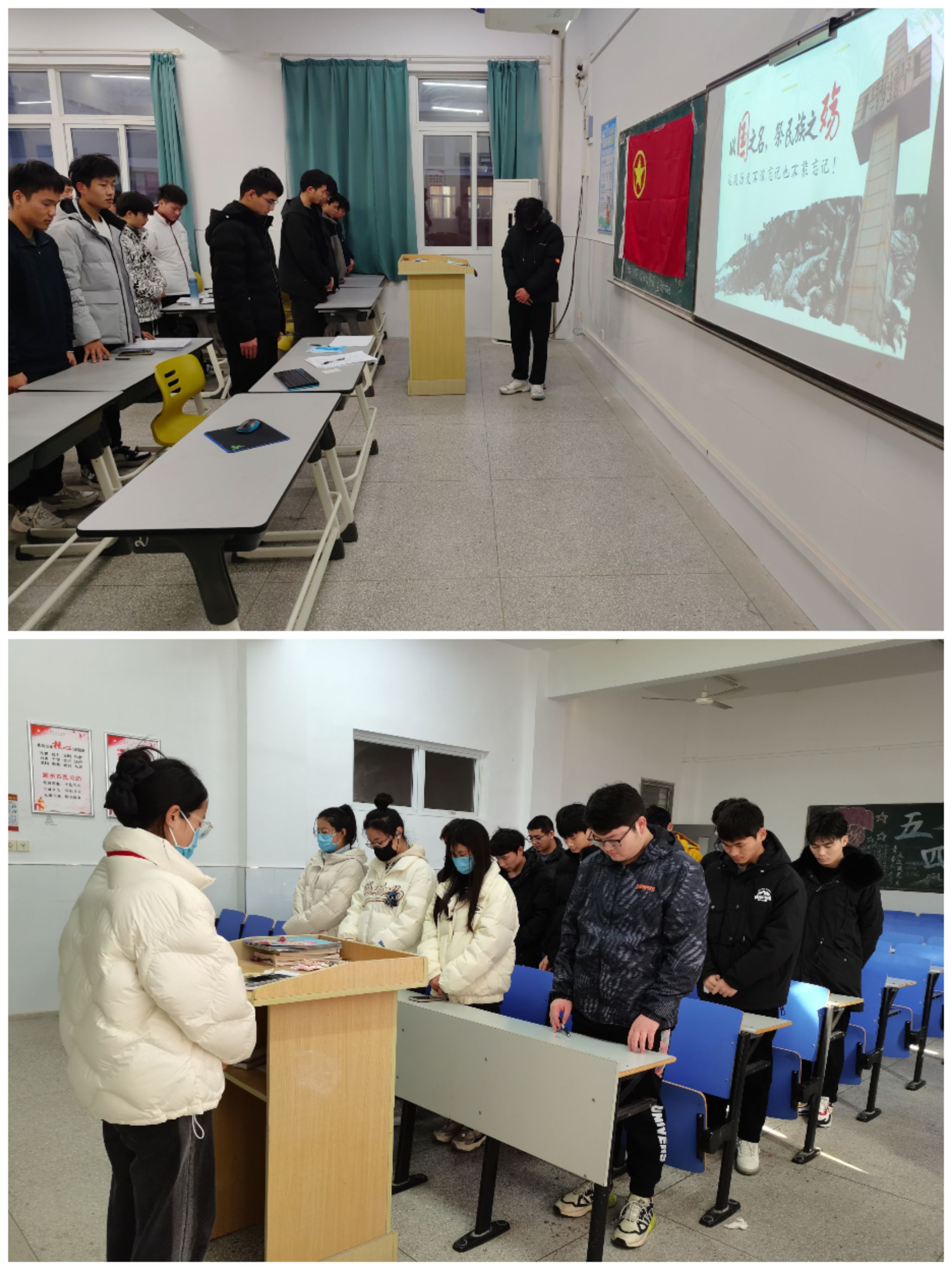 活动伊始,各班团支书宣读悼念活动公祭词,同学们起立默哀一分钟,缅怀30多万遇难同胞。活动中,各团支部紧紧围绕团日主题,向同学们介绍了国家公祭日的由来及意义,通过播放有关抗日战争的视频,制作PPT图文宣讲,再现日本侵略者战争罪行来教导同学们要勿忘国耻,牢记使命,把爱国主义信仰永固于灵魂深处。