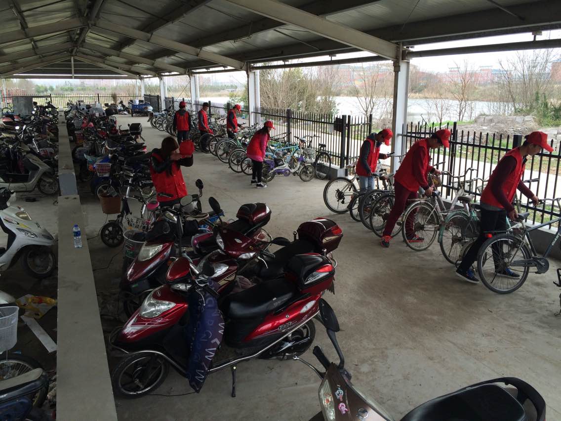 随后, 14级软件班团支部又引领同学们,把校园内各处自行车摆放整齐,并对车棚进行了彻底清扫,重新还给校园一片整洁。活动时间不长,但雷锋精神却在每个人的心口传递。