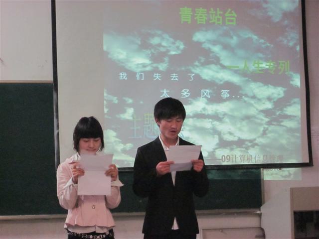 2011年4月13日下午3:00—5:00,信息工程系09计算机信息管理班在2504教室举行了一场主题为“青春站台—人生专列”的主题班会。