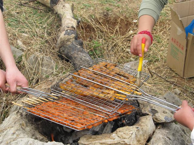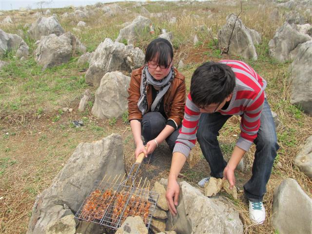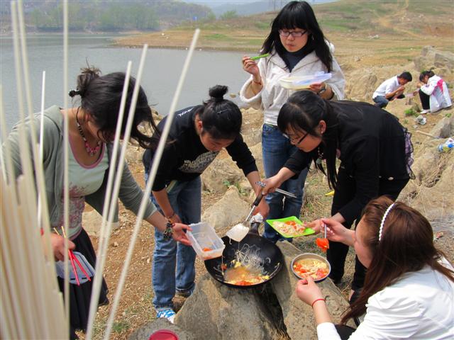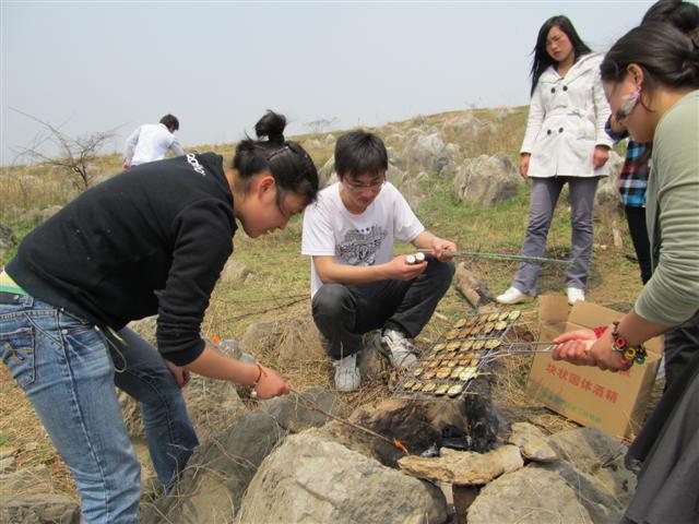 同学们大多没有过野外烧烤经验,但是在杨老师的安排下大家还是很默契地有人负责清洗蔬菜,有人负责制作烤串,有人负责堆灶,有人负责生火,有人负责烧烤,有人负责加调料。虽然会被烟火熏到流泪,虽然会满面尘土,但是谁都没有去抱怨偷懒,而是越来越默契地互相协助。从开始烧焦的韭菜叶和烤不熟的鱿鱼到后来色香味俱佳的烧烤,整个过程中大家一边学一边改进,也一边说笑着互相分享着一起努力得来的劳动成果。在烧烤中穿插了脑筋急转弯竞答,真心话大冒险游戏,芬芳的肉香伴着愉悦、欢快的声韵,为寂静的湖畔平添了几分情趣,几分生意。