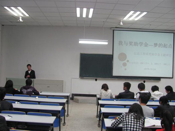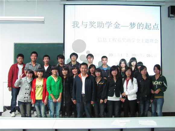 10月24日晚7:00,信息工程系09计维1、2班,09软件,09信管共四个班级190余人在北阶102顺利举行“我与奖助学金——梦的起点”主题班会。