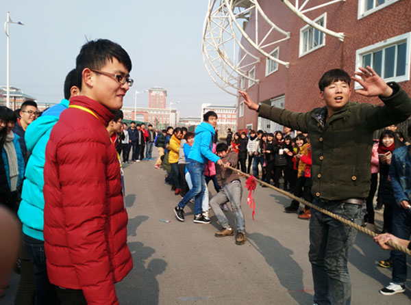 为了增进学生之间的交流,缓解学生对即将到来的期末考试压力,1月7日信息工程系在学校体育场举办了一场别开生面的拔河比赛。此次比赛由格林豪泰龙蟠店赞助,并为获奖班级准备了精美的奖品。