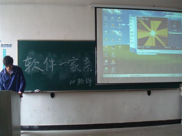 2011年4月8号下午四点,10软件技术班在2502教室举行了题为“软件一家亲”的主题班会。本次的主题班会内容丰富,以PPT的形式向同学们展示了从相识到现在点点滴滴的镜头,有妙趣横生的游戏,有美妙动听的演唱,处处体现了10软件技术班是个团结合作的大家庭。