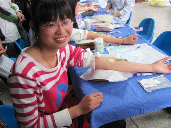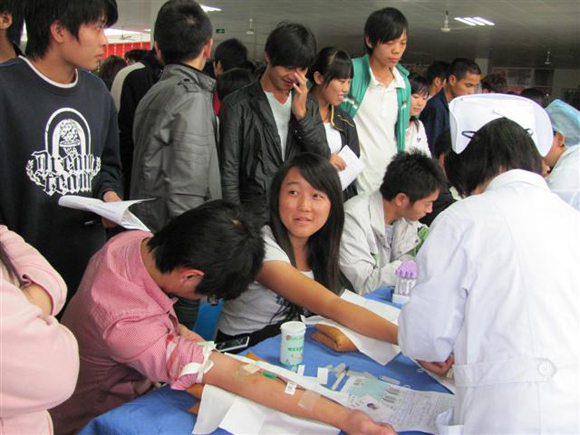 2010年年10月13日、由学生处组织的奉献爱心无偿献血活动在食堂举行。我系青年志愿者和入党积极分子们踊跃了投入了献血大军,长长的队伍就是无私奉献最好的说明。