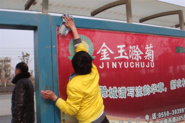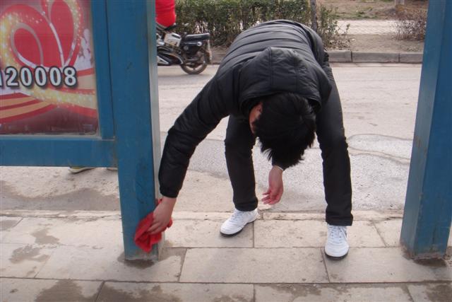 志愿者们冒着寒风对公交站牌和周边环境进行了认真细致的清扫,得到了来往市民的认可和赞扬。