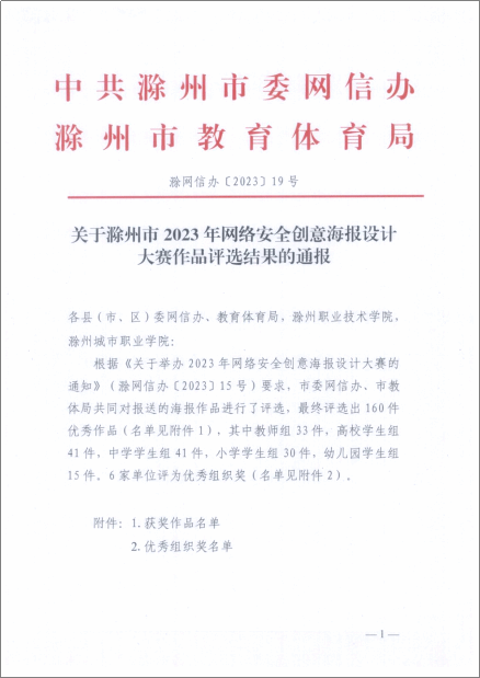 近日,滁州市委网信办、市教体局联合组织的2023年网络安全创意海报设计大赛作品评选结果公布,Beat365师生争创佳绩,陈潇潇、阚迪、朱睿三位指导教师带领同学们斩获一等奖两项、二等奖两项。