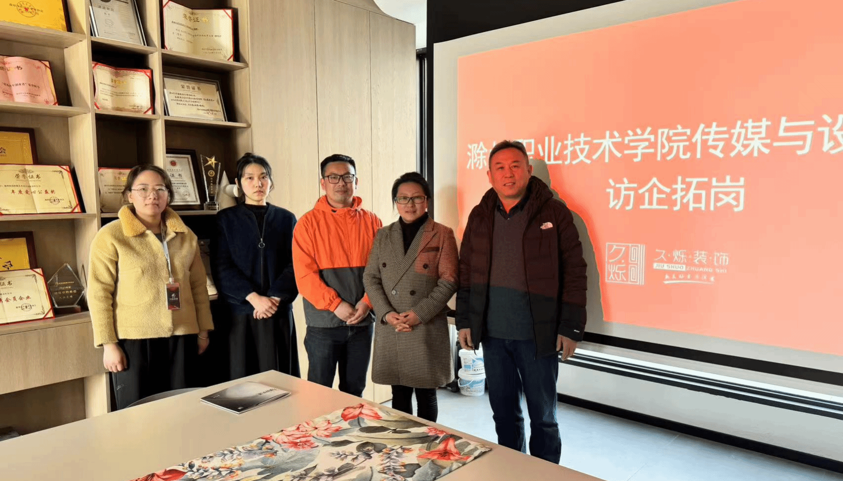 首先走访的是滁州市久烁装饰有限公司,公司负责人热情地接待并带领参观了公司的设计展示区与员工办公区,详细地介绍了公司的发展历程、组织架构、文化理念、业务经营、人才需求等方面的情况,明确表示公司秉持着“为美好生活提案”的理念,希望进一步促成校企合作,吸纳更多优秀的设计人才的加入。王广保和黄瑞表示对久烁装饰在设计水平、技术创新、服务质量、品牌形象各方面的成绩的认可,同时介绍了我院设计艺术系室内艺术设计专业的人才培养与顶岗实习情况,希望积极促进室内艺术设计专业人才培养与本公司用人需求的精准对接,共同合力培养大批高素质技能型人才,助力地方经济发展。