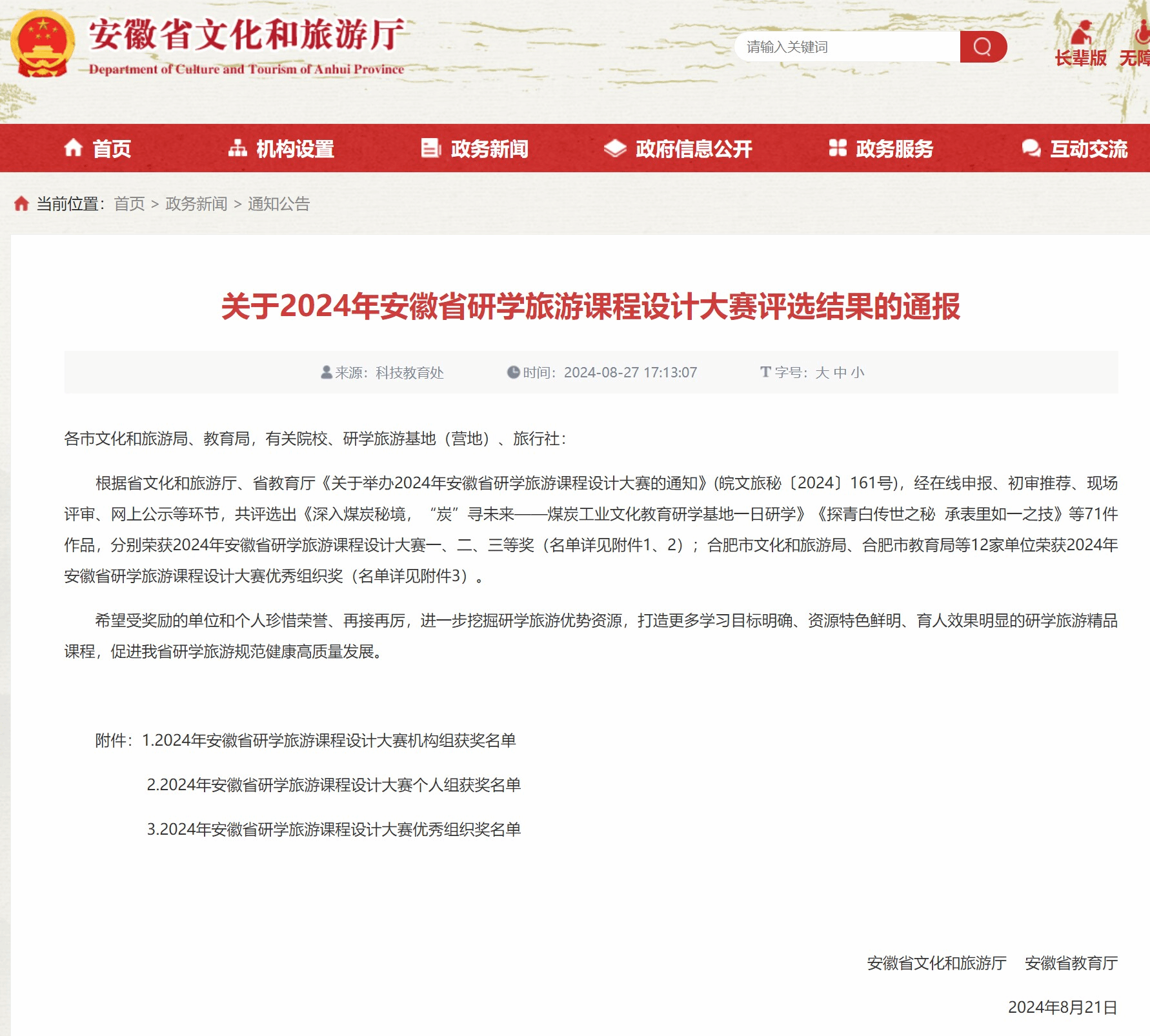 此次大赛由省文化和旅游厅、省教育厅共同主办,以“研学安徽·行走的思政课堂”为主题,探索研学课程思政化新路径。大赛通过提交研学旅游课程设计方案的形式进行参赛,据官方统计,本次大赛收到来自全省各地的机构、个人参赛作品高达805件,涉及16个地市及部分省直单位、普通高等院校、中等职业学校和研学旅游相关机构等。经过严格筛选,216件作品成功晋级决赛。8月14—15日,现场展示汇报在合肥举行,经过组委会专家组评定,71件分别荣获2024年安徽省研学旅游课程设计大赛一、二、三等奖,其中机构组中仅有三家高校获奖。