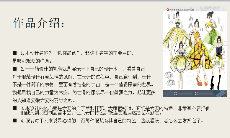 这些服装设计充分展示了我院学生活跃的思维能力和良好的设计能力,通过这个比赛,不但丰富了同学们的课余生活,也一定程度上提高他们的专业能力,取得了很大的效果。