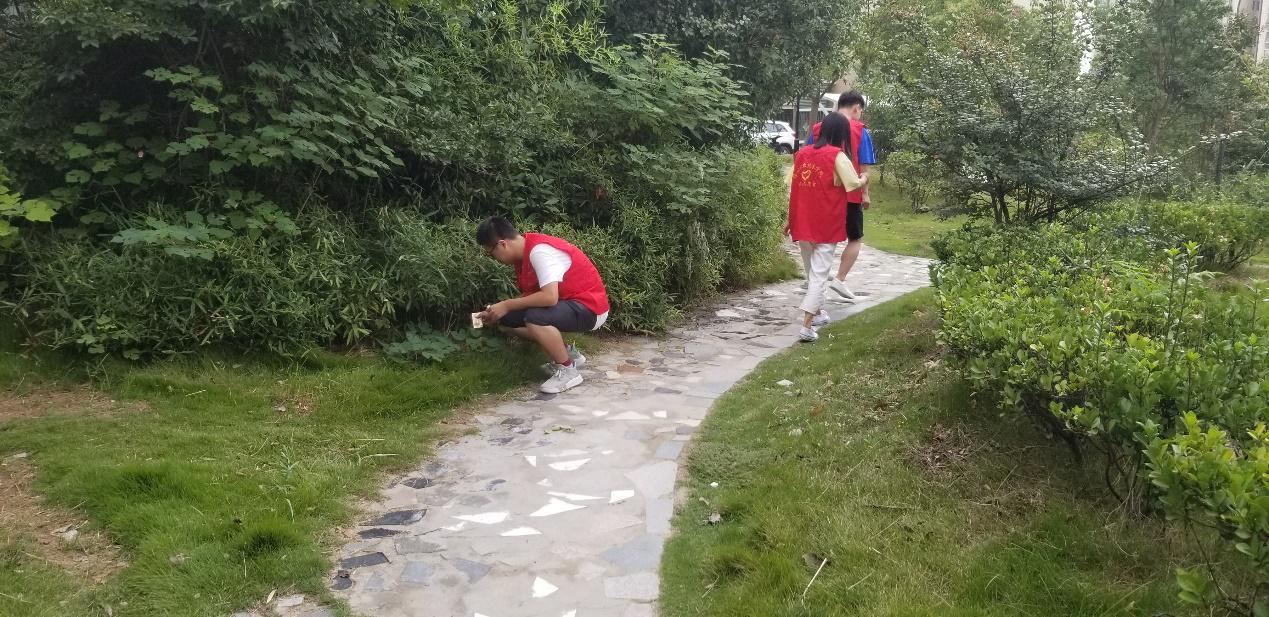 社区内,志愿者们帮忙清理建筑垃圾,绿化带内的果皮纸屑以及杂物,几名新生积极参与其中。
