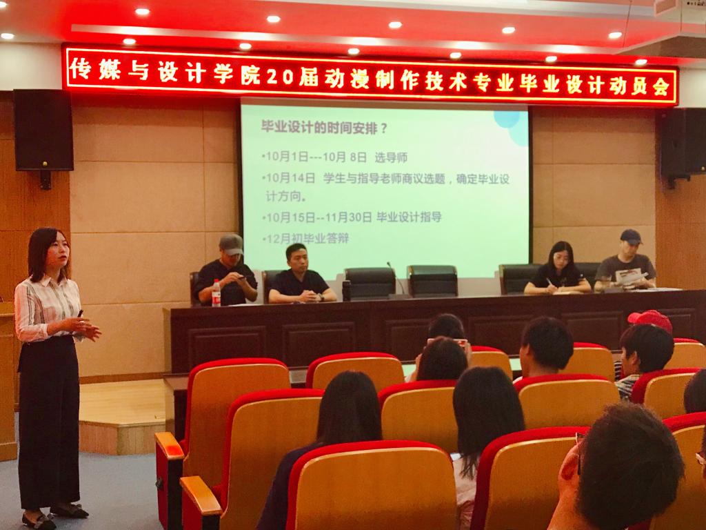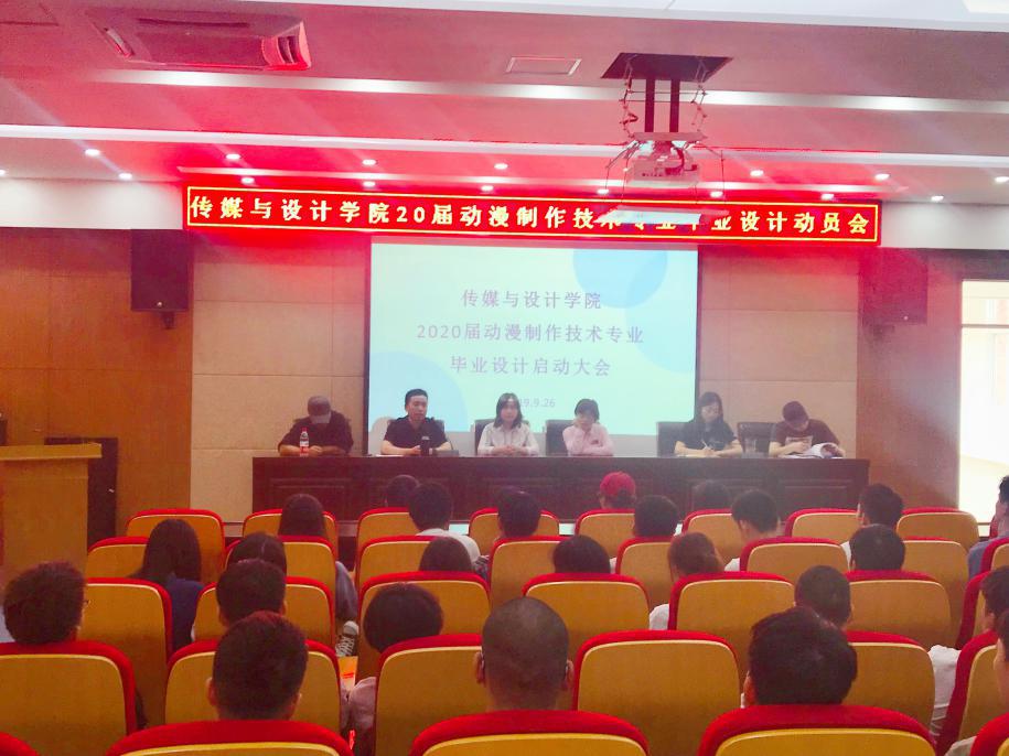 2019年9月26日上午,在南阶205报告厅,传媒与设计学院2020届动漫制作技术专业毕业设计动员会顺利举行。会议由范文娟老师主持,专兼职毕业设计指导老师共11名及动漫制作技术专业学生110余人到场。
