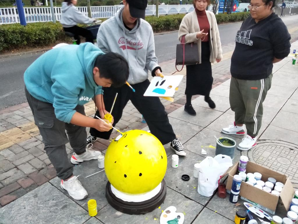 公园的隔离墩主要是为了防止车辆进入或乱放,此次学生们的彩绘让公园里的球形隔离墩瞬间变成了一个个可爱的图案。原本不起眼的球形石墩一个个华丽变身,被手绘上了各种各样的图案。